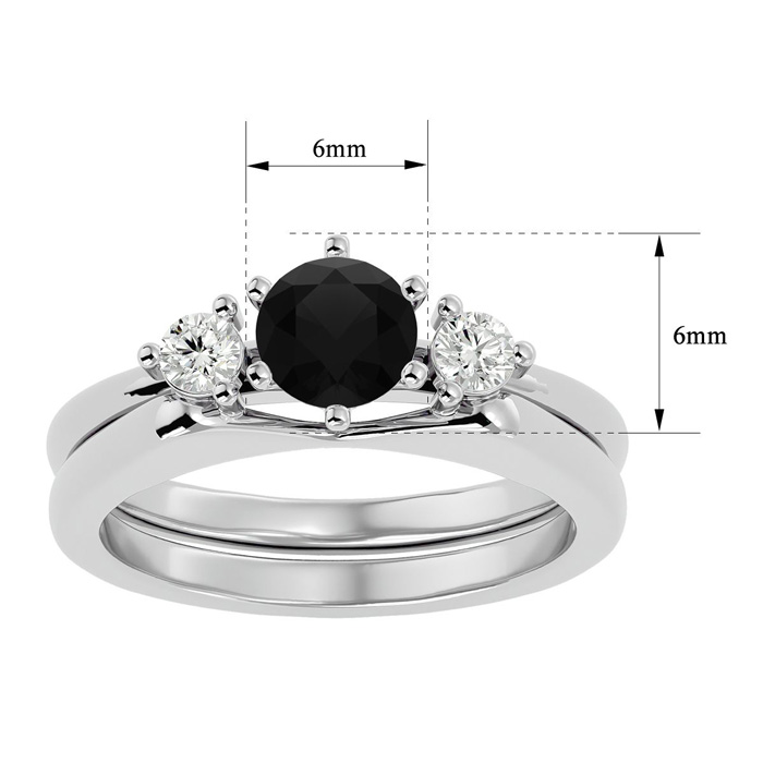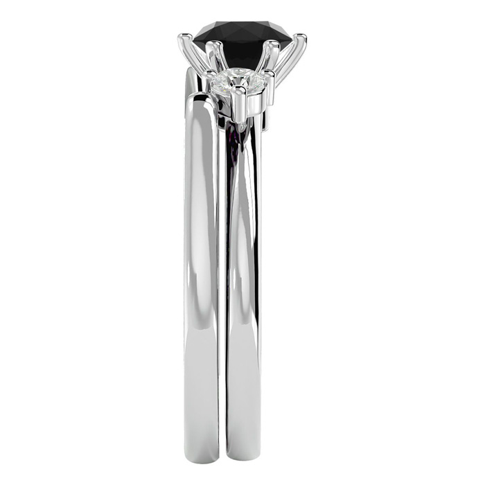 This fabulous diamond set features a sparkling 3/4 carat round shape center black diamond in I3 clarity. It is surrounded by two side diamonds in the ring enhancer totaling 1/5 carat. Total carat weight is 1 carat. This ring is in 14 karat white gold.