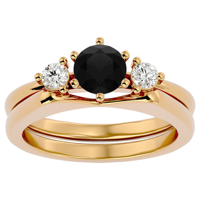 This fabulous diamond set features a sparkling 3/4 carat round shape center black diamond in I3 clarity. It is surrounded by two side diamonds in the ring enhancer totaling 1/5 carat. Total carat weight is 1 carat. This ring is in 14 karat yellow gold.