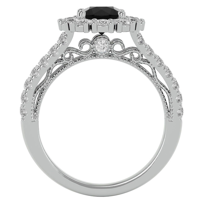 This fabulous diamond engagement ring features a sparkling 2 carat round shape center black diamond in I3 clarity. It is surrounded by a halo of 36 side diamonds totaling 2 carats. Total carat weight is 4 carats. This ring is in 14 karat white gold.
