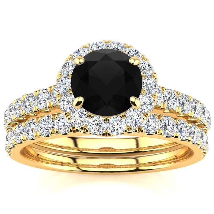 1 1/2 Carat Round Black Moissanite Halo Bridal Set In 14 Karat Yellow Gold