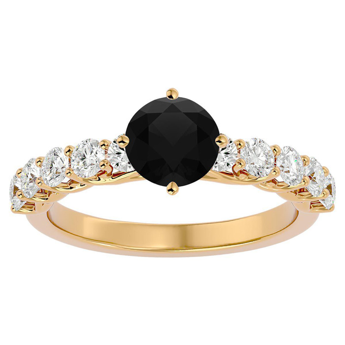 This fabulous moissanite engagement ring features a sparkling 1 carat round shape center black moissanite in VVS1-VVS2 clarity. It is surrounded by 10 side moissanites totaling 3/4 carat. Total carat weight is 1 3/4 carats. This ring is in 14 karat yellow gold.