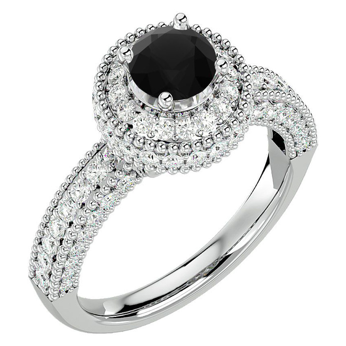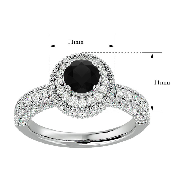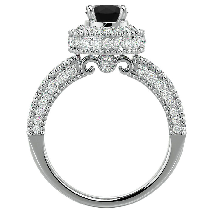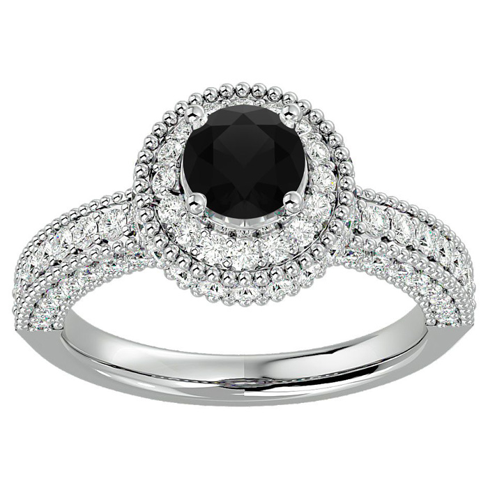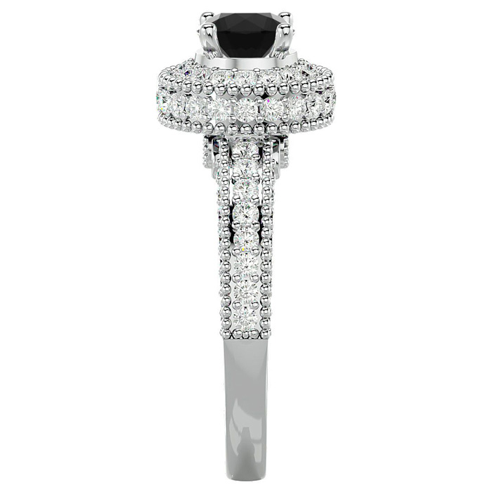 This fabulous moissanite engagement ring features a sparkling 3/4 carat black center moissanite in VVS1-VVS2 clarity. It is surrounded by a halo of 86 side moissanites totaling 1 carat. Total carat weight is 1 3/4 carats. This ring is in 14 karat white gold.
