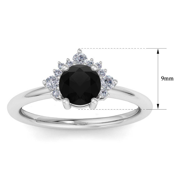 This unique engagement ring features a 0.80 carat center black moissanite. It is accented with a crown of 11 moissanites in E-F color, VVS1-VVS2 clarity. Total carat weight is approximately 1 carat. This ring is in 14 karat white gold.