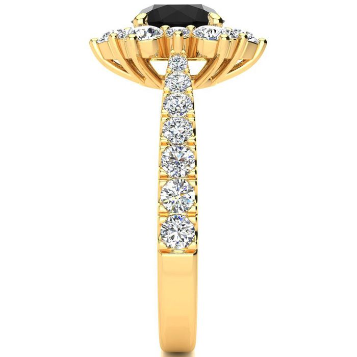 This ring features a 1/2 carat round shape center black moissanite in VVS1-VVS2 clarity. There are 26 sparkling side moissanites in a halo at approximately 1/2 carat. Total gem weight is approximately 1 carat. This ring is in 14 karat yellow gold. Ring top measures 8x8mm.