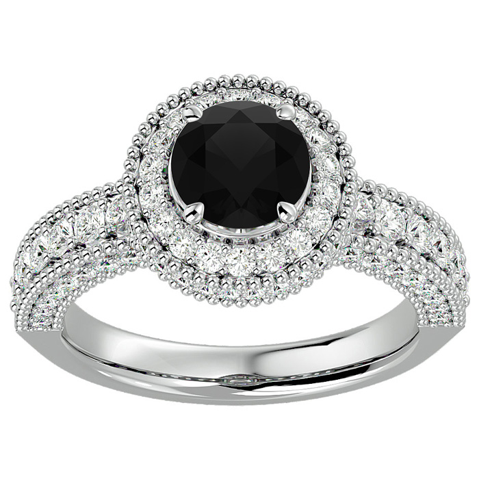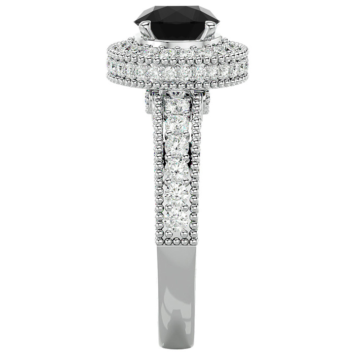 This fabulous moissanite engagement ring features a sparkling 1 carat center black moissanite in VVS1-VVS2 clarity. It is surrounded by a halo of 153 side moissanites totaling 1 1/2 carats. Total carat weight is 2 1/2 carats. This ring is in 14 karat white gold.