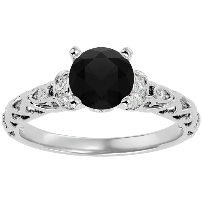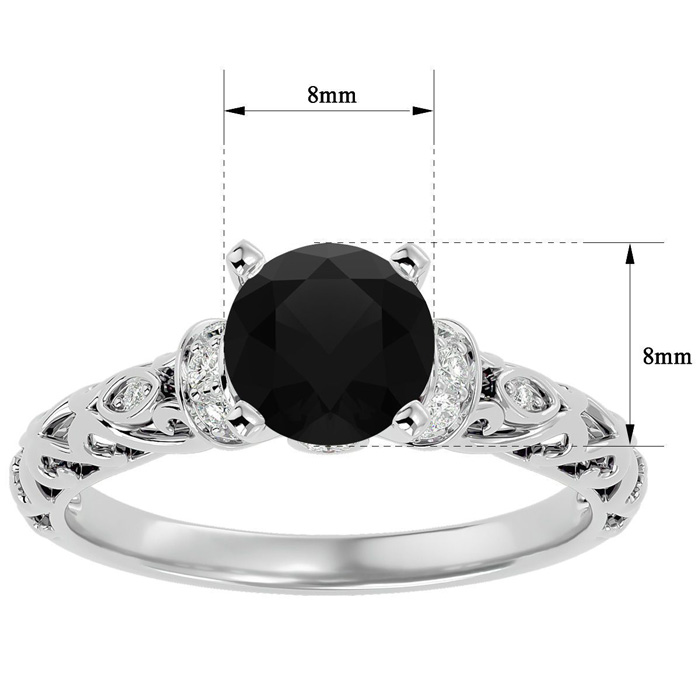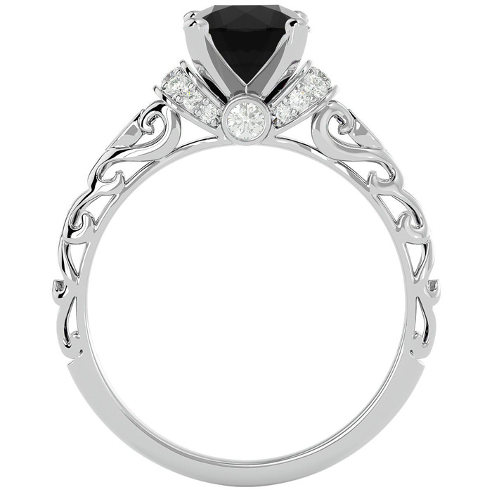This vintage ring features a sparkling 2 carat center black moissanite in VVS1-VVS2 clarity. It is accented with 18 side moissanites at 0.28 carats. Total carat weight is 2 1/4 carats. This ring is in 14 karat white gold.