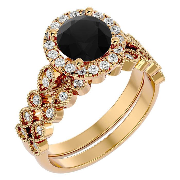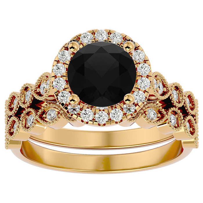 2 Carat Halo Black Moissanite Bridal Set In 14 Karat Yellow Gold