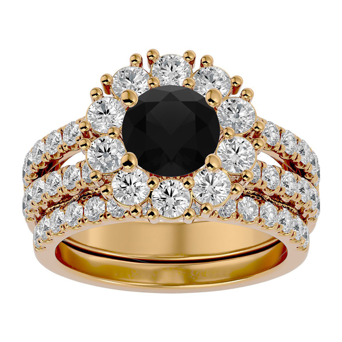 This fabulous moissanite bridal set features a sparkling 1 1/2 carat round shape center black moissanite in VVS1-VVS2 clarity. It is surrounded by a halo of 52 side moissanites between the ring and band totaling 2 carats. Total carat weight is 3 1/2 carats. This ring is in 14 karat yellow gold.