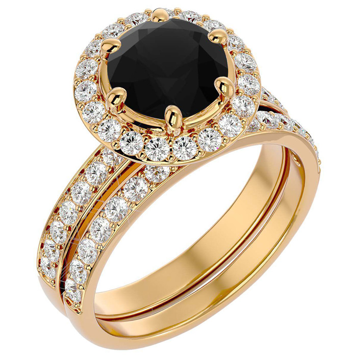 3 Carat Black Moissanite Halo Bridal Set In 14 Karat Yellow Gold With 2 Carat Center Black Moissanite