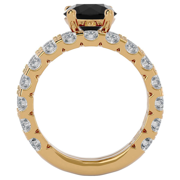 This elegant moissanite bridal set features a sparkling 2 carat center black moissanite in VVS1-VVS2 clarity. It is surrounded by 29 sparkling moissanites totaling 3 carats. Total carat weight is approximately 5 carats. This ring is in 14 karat yellow gold.