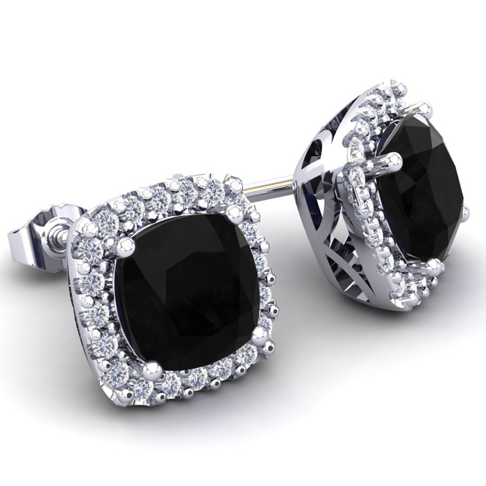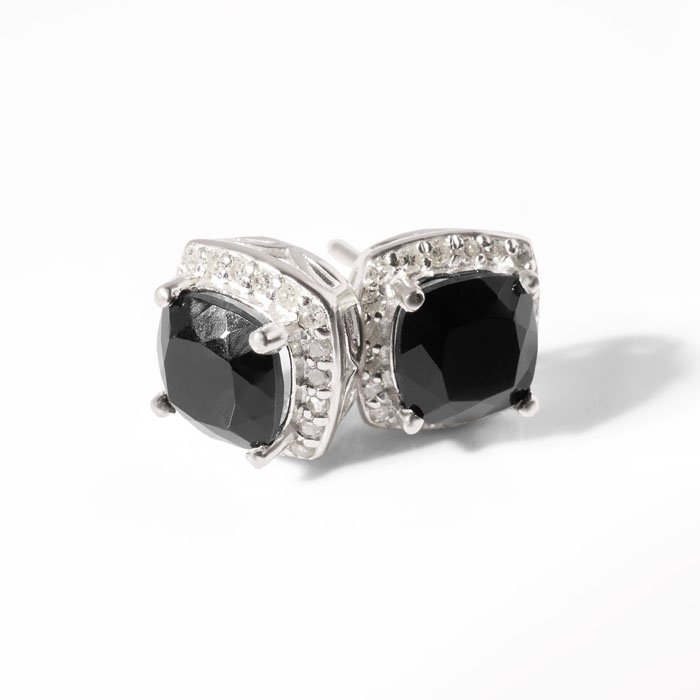 These stunning black onyx earrings features two 6x6mm cushion shape black onyx gemstones each weighing approximately 1 carat. It is surrounded by 44 sparkling diamonds in I-J color, I1-I2 clarity at 1/4 carat. Total carat weight is 2 1/4 carats. These earrings are crafted in sterling silver and have comfortable and secure post with friction backs.