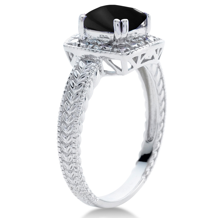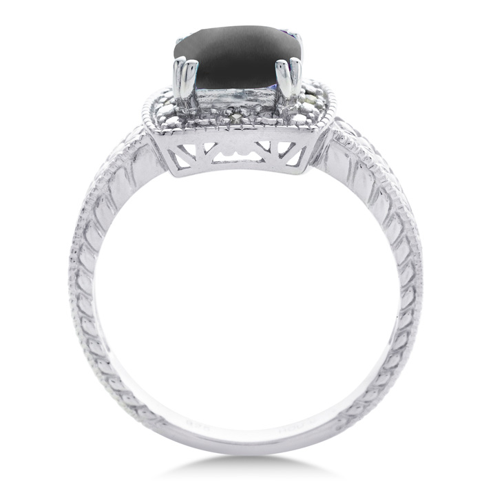 This black onyx ring features one 7x7mm cushion shape black onyx gemstone. It is surrounded by 4 sparkling diamonds totaling 0.02 carats in I-J color, I1-I2 clarity. Total carat weight is approximately 1 1/4 carats. This ring is in sterling silver.