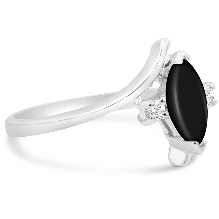 This black onyx ring features one 8x4mm marquise shape black onyx gemstone. It is surrounded by 2 sparkling diamonds totaling 0.05 carats in I-J color, I1-I2 clarity. Total carat weight is approximately 1/2 carat. This ring is in sterling silver.