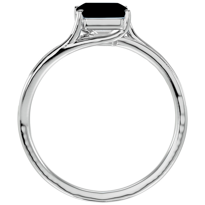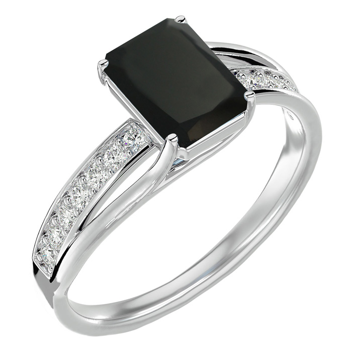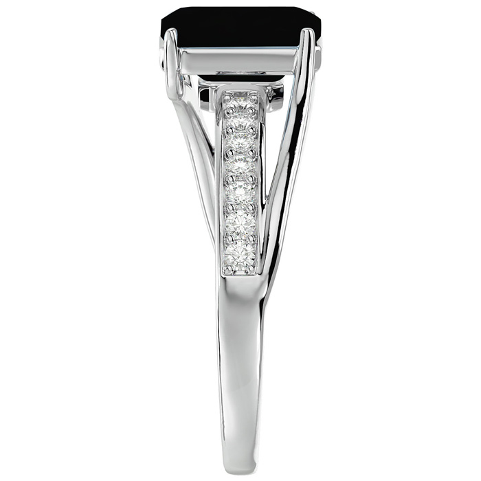 This black onyx ring features one 8x6mm emerald shape black onyx gemstone. It is surrounded by 14 sparkling diamonds totaling 1/5 carat in I-J color, I1-I2 clarity. Total carat weight is approximately 1 3/4 carats. This ring is in sterling silver.