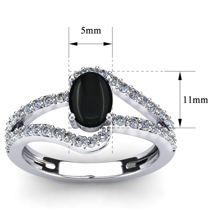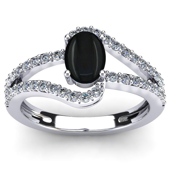 This black onyx ring features one 7x5mm oval shape black onyx gemstone. It is surrounded by 42 sparkling diamonds totaling 0.40 carats in I-J color, I1-I2 clarity. Total carat weight is approximately 1.40 carats. This ring is in sterling silver.