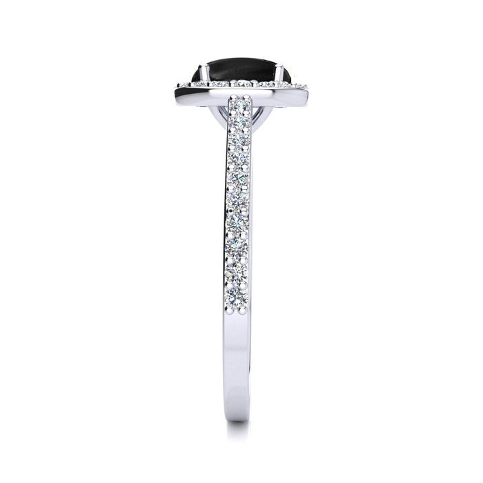 This black onyx ring features one 7x5mm oval shape black onyx gemstone. It is surrounded by 38 sparkling diamonds totaling 1/3 carat in I-J color, I1-I2 clarity. Total carat weight is approximately 1 carat. This ring is in sterling silver.