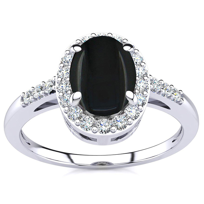 1 Carat Oval Shape Black Onyx and Halo Diamond Ring In Sterling Silver