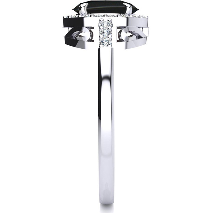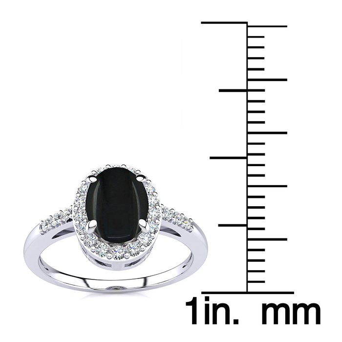 This black onyx ring features one 7x5mm oval shape black onyx gemstone. It is surrounded by 24 sparkling diamonds totaling 1/8 carat in I-J color, I1-I2 clarity. Total carat weight is approximately 1.12 carats. This ring is in sterling silver.