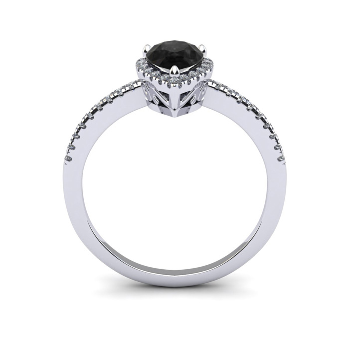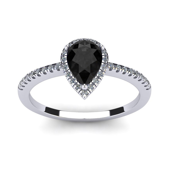 This black onyx ring features one 7x5mm pear shape black onyx gemstone. It is surrounded by 36 sparkling diamonds totaling 1/5 carat in I-J color, I1-I2 clarity. Total carat weight is approximately 1 carat. This ring is in sterling silver.