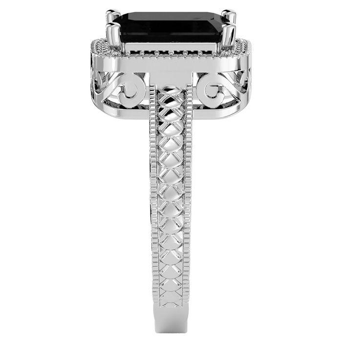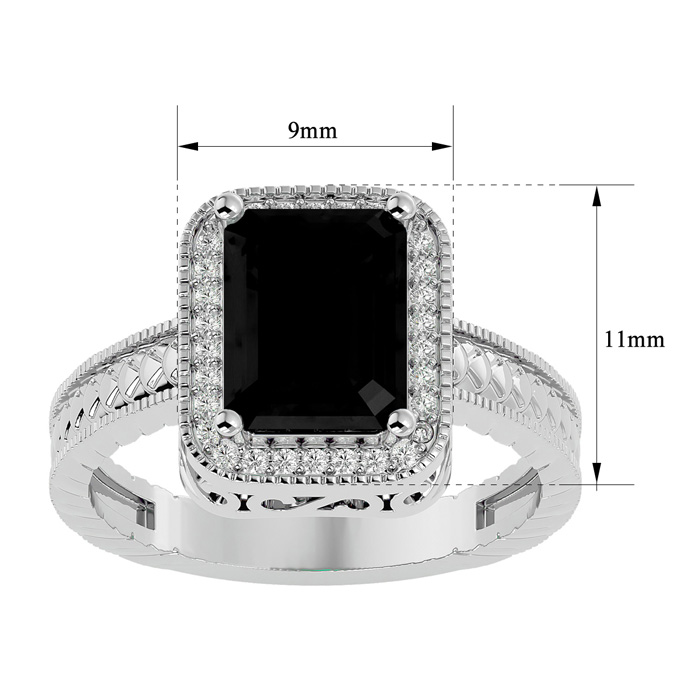 This black onyx ring features one 9x7mm emerald shape black onyx gemstone. It is surrounded by 38 sparkling diamonds totaling 1/5 carat in I-J color, I1-I2 clarity. Total carat weight is approximately 2 3/4 carats. This ring is in sterling silver.