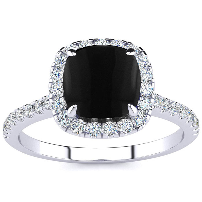 This black onyx ring features one 7mm cushion cut black onyx gemstone. It is surrounded by 38 sparkling diamonds totaling 1/2 carat in I-J color, I1-I2 clarity. Total carat weight is approximately 2 carats. This ring is in sterling silver.