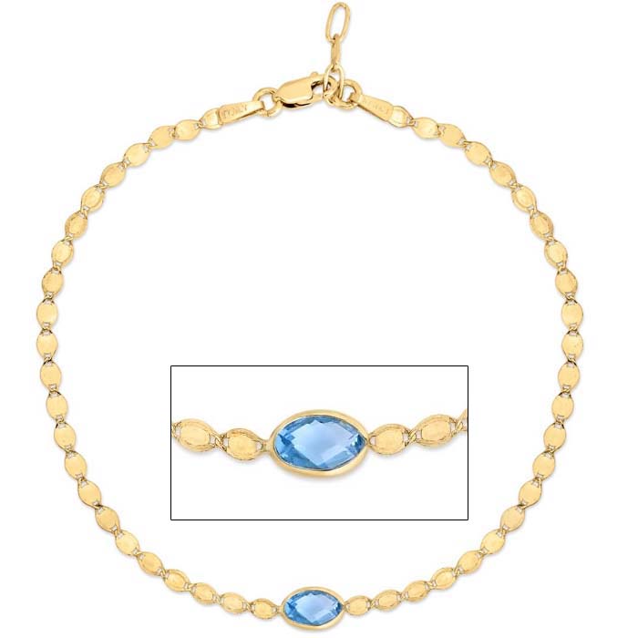 This blue topaz bracelet features one 6x4mm oval shape blue topaz gemstone. The bracelet is a 7.25" 2.2mm mirrored chain with a lobster-claw clasp.