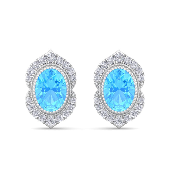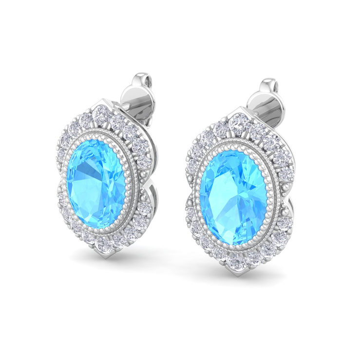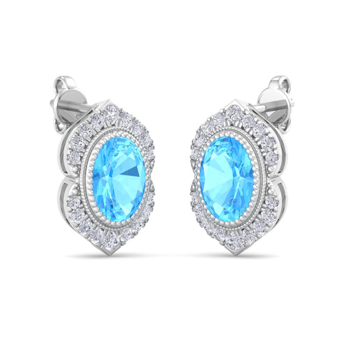 Retrograde Birthstones™ 2 1/2 Carat Oval Shape Blue Topaz and Diamond Earrings In 14K White Gold