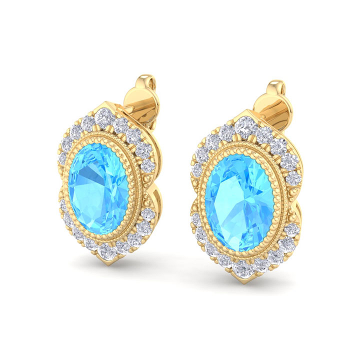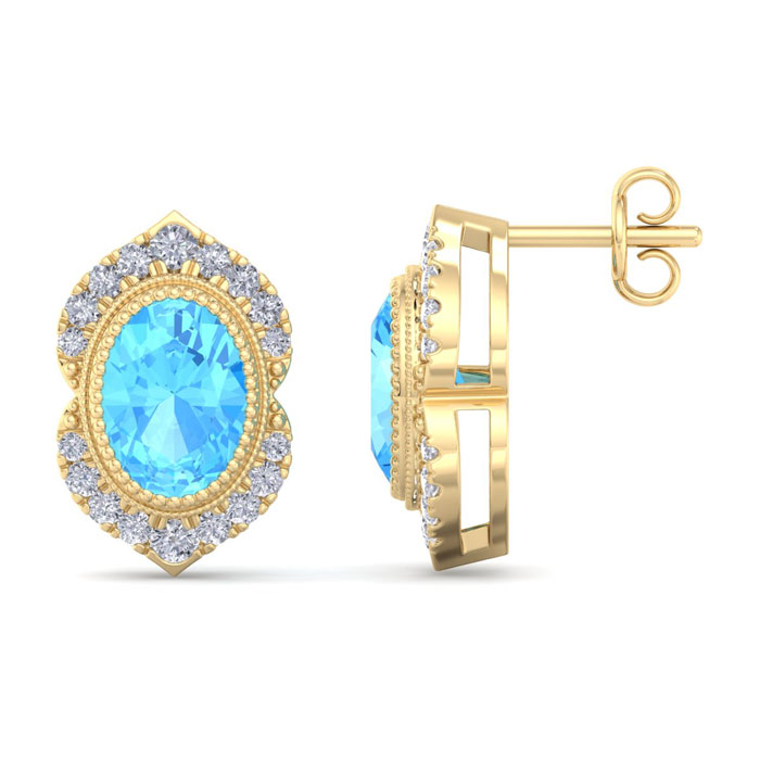 These gemstone earrings feature two 7x5mm oval shape blue topaz gemstones each weighing approximately 1 carat. There are 36 sparkling diamonds in I-J color, I1-I2 clarity totaling approximately 1/2 carat. Total carat weight is 2 1/2 Carats. These earrings are in 14 karat yellow gold. *Retrograde Birthstones™ flips the idea of traditional birthstones. Wear your ½ birthday birthstone, your Retrograde Birthstone, “The Birthstone For Your Bad Side™.