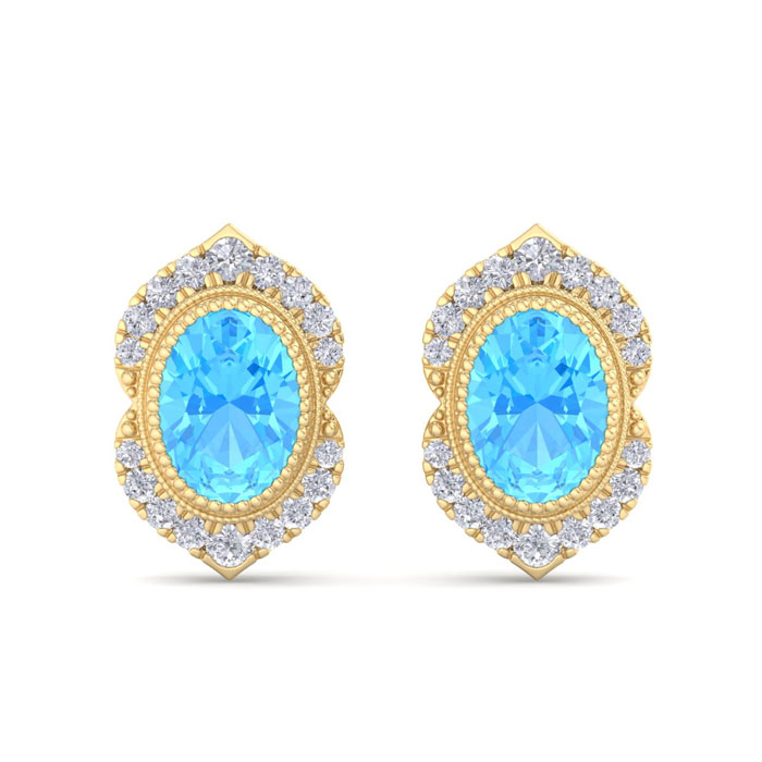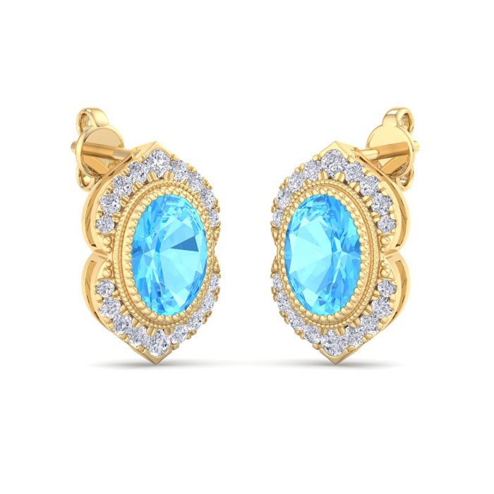 Retrograde Birthstones™ 2 1/2 Carat Oval Shape Blue Topaz and Diamond Earrings In 14K Yellow Gold