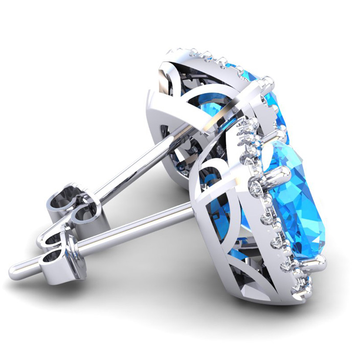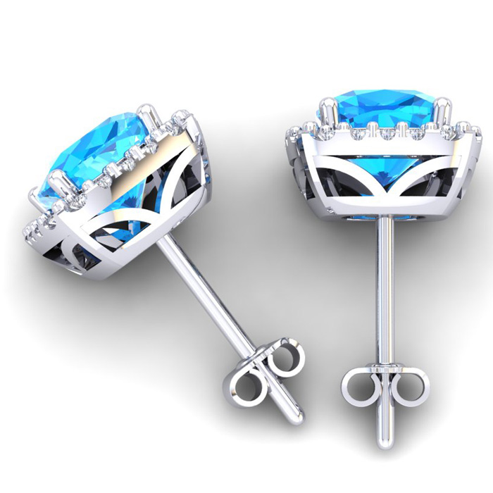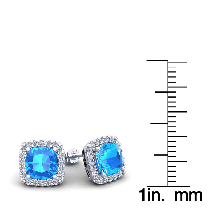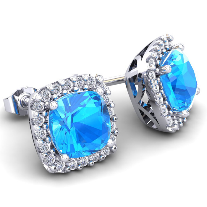 These stunning blue topaz earrings features two 6x6mm cushion shape blue topaz gemstones each weighing approximately 1 carat. It is surrounded by 44 sparkling diamonds in I-J color, I1-I2 clarity at 1/4 carat. Total carat weight is 2 1/4 carats. These earrings are crafted in sterling silver and have comfortable and secure post with friction backs.