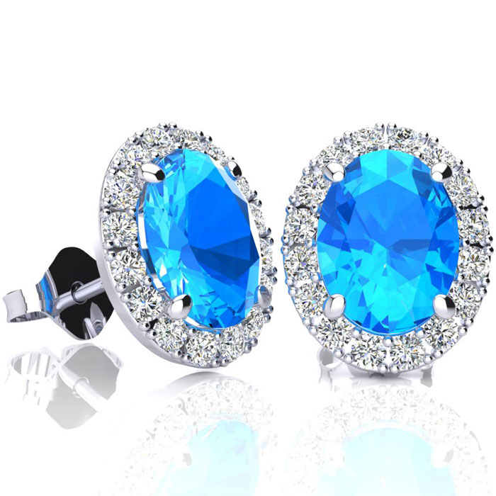 2 3/4 Carat Oval Shape Blue Topaz and Halo Diamond Earrings In Sterling Silver