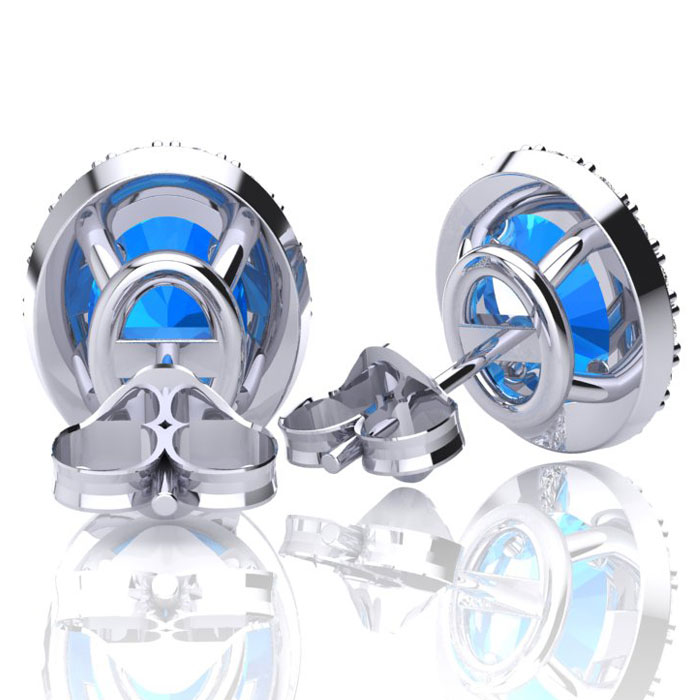 These stunning blue topaz earrings features two 8x6mm oval shape blue topaz gemstones each weighing approximately 1 1/4 carats. It is surrounded by 40 sparkling diamonds in I-J color, I1-I2 clarity at 1/3 carat. Total carat weight is 2 3/4 carats. These earrings are crafted in sterling silver and have comfortable and secure post with friction backs.