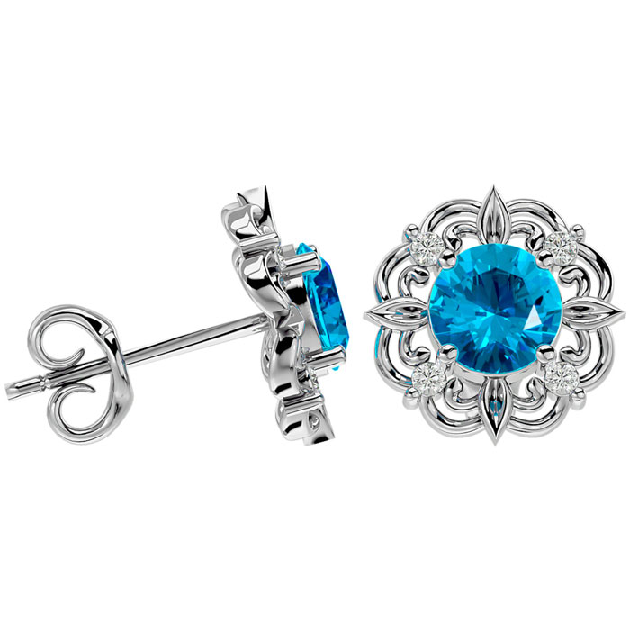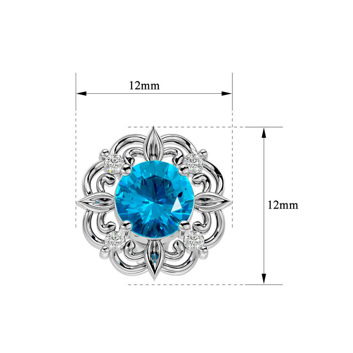 These stunning blue topaz earrings features two round shape 6x6mm blue topaz gemstones each weighing approximately 1 carat. It is surrounded by 8 sparkling diamonds in I-J color, I1-I2 clarity at 1/10 carat. Total carat weight is 2.10 carats. These earrings are crafted in sterling silver and have comfortable and secure post with friction backs.