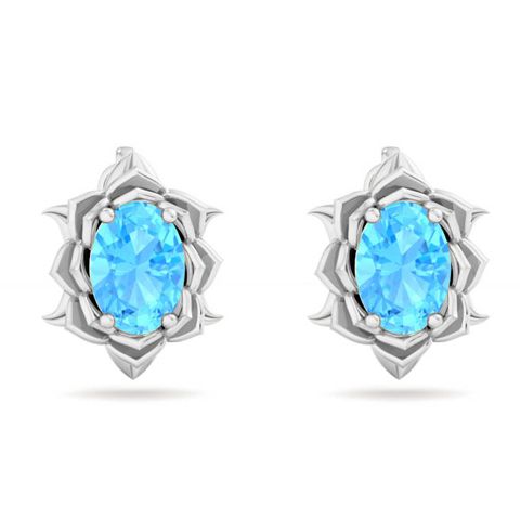 2 Carat Oval Shape Blue Topaz Ornate Stud Earrings In 14K White Gold