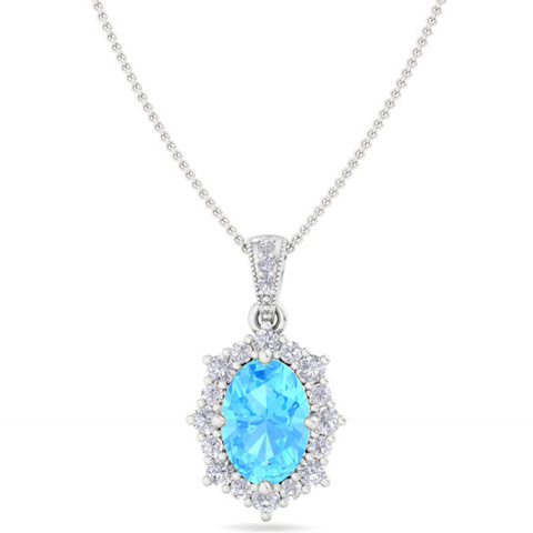 1 3/4 Carat Oval Shape Blue Topaz and Diamond Necklace In 14K White Gold