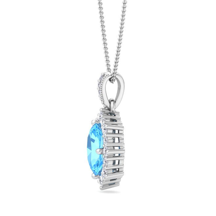 This gemstone necklace features one 8x6mm oval shape blue topaz gemstone weighing approximately 1 1/2 carats. There are 19 sparkling diamonds in I-J color, I1-I2 clarity totaling approximately 1/3 carat. Total carat weight is 1 3/4 carats. This necklace is in 14 karat white gold and comes with an 18 inch box chain with spring ring clasp.