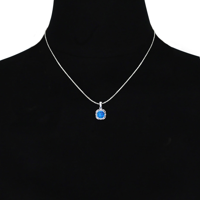 2 Carat Cushion Cut Blue Topaz and Diamond Necklace In Sterling Silver With 18 Inch Chain