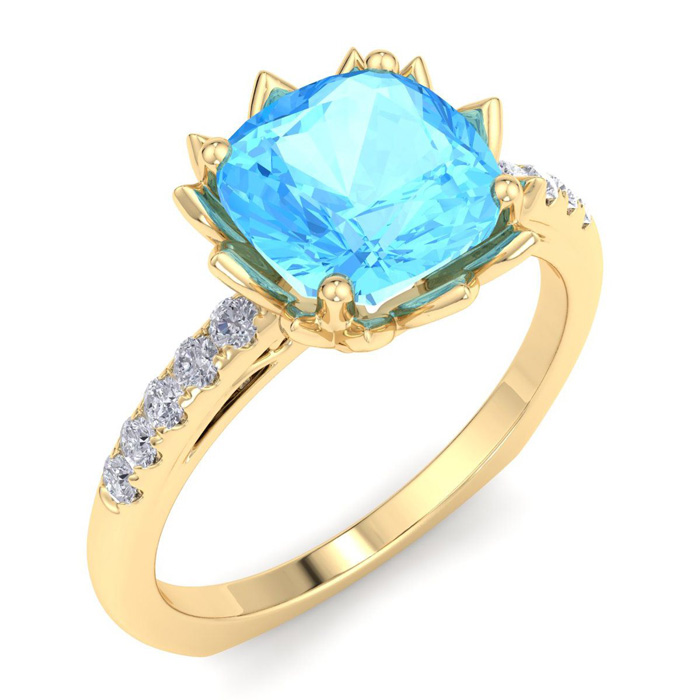 Retrograde Birthstones™ 1 1/2 Carat Cushion Cut Blue Topaz and Diamond Ring In 14K Yellow Gold