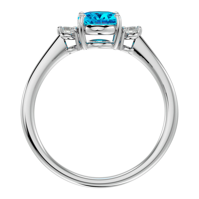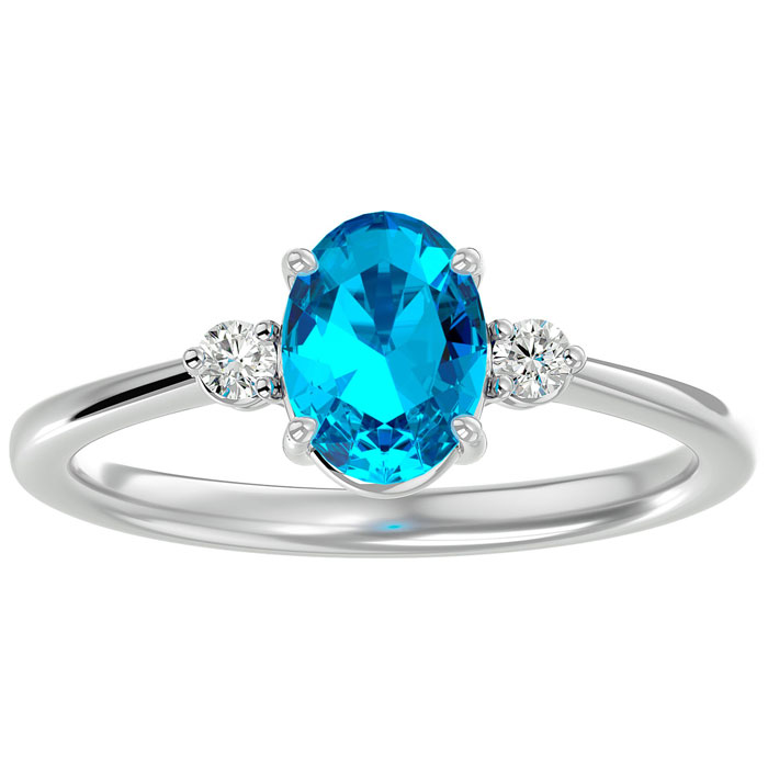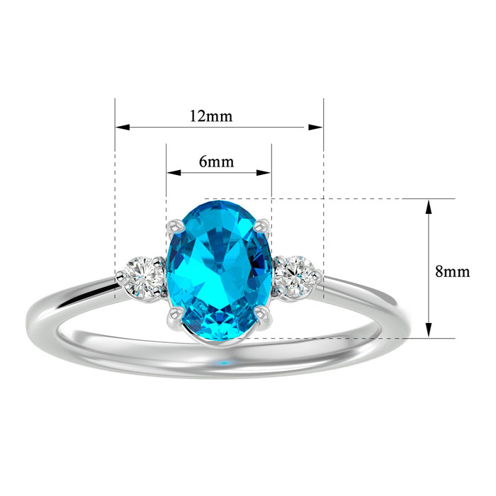 This blue topaz ring features one 8x6mm oval shape blue topaz gemstone. It is surrounded by two sparkling diamonds totaling 1/10 carat in I-J color, I1-I2 clarity. Total carat weight is approximately 1 1/3 carats. This ring is in sterling silver.