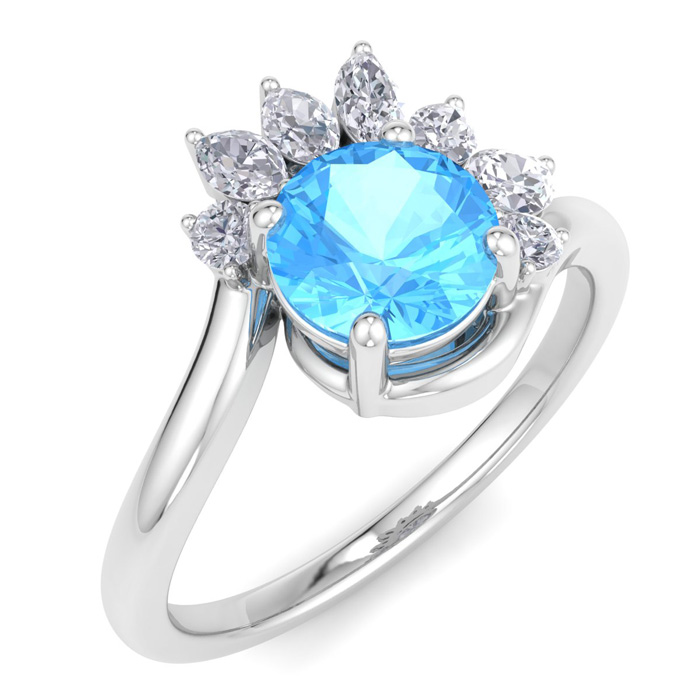 This gemstone ring features one 6mm round blue topaz gemstone weighing approximately 1 carat. There are 7 sparkling marquise and round diamonds in I-J color, I1-I2 clarity totaling approximately 1/4 carat. Total carat weight is 1 1/4 carats. This ring is in 14 karat white gold.