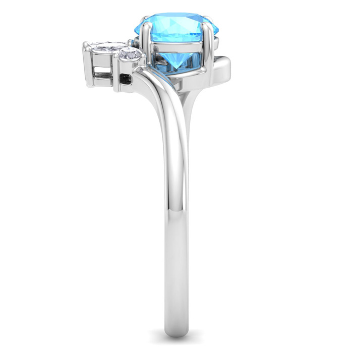 This gemstone ring features one 6mm round blue topaz gemstone weighing approximately 1 carat. There are 7 sparkling marquise and round diamonds in I-J color, I1-I2 clarity totaling approximately 1/4 carat. Total carat weight is 1 1/4 carats. This ring is in 14 karat white gold.