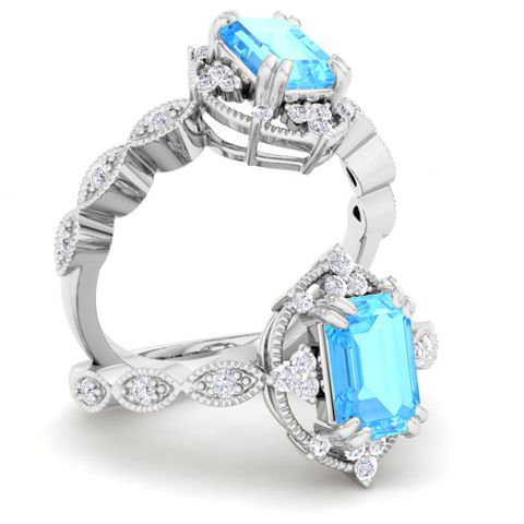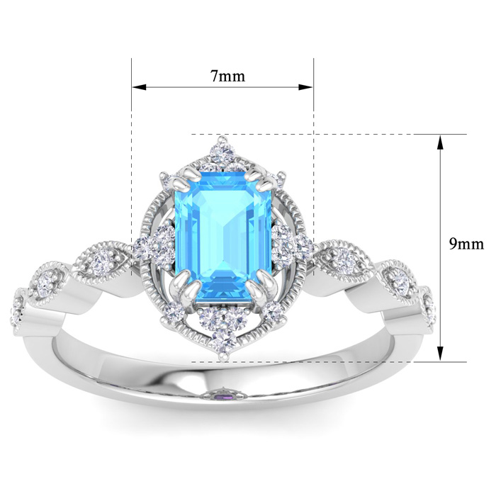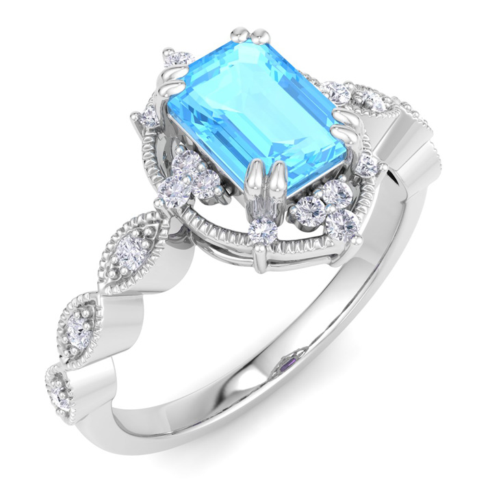 This gemstone ring features one 7x5mm octagon shape blue topaz gemstone weighing approximately 3/4 carat. There are 22 sparkling round diamonds in I-J color, I1-I2 clarity totaling approximately 1/4 carat. Total carat weight is 1 carat. This ring is in 14 karat white gold.