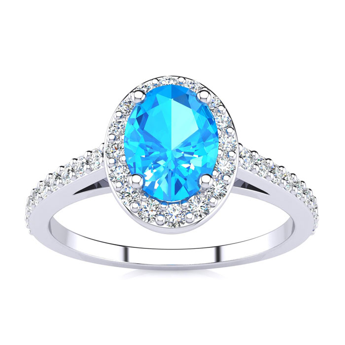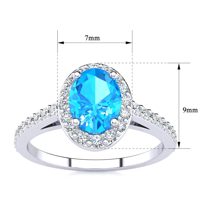 This blue topaz ring features one 7x5mm oval shape blue topaz gemstone. It is surrounded by 38 sparkling diamonds totaling 1/3 carat in I-J color, I1-I2 clarity. Total carat weight is approximately 1 carat. This ring is in sterling silver.
