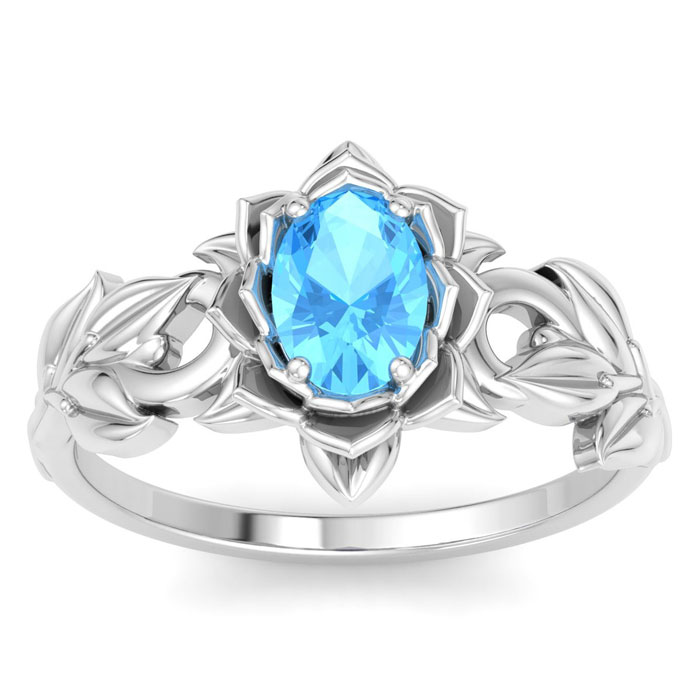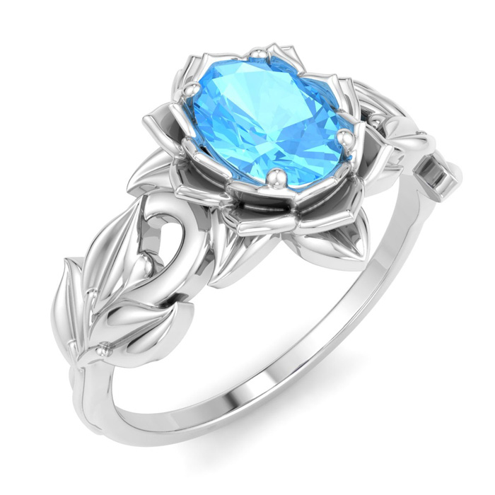 Retrograde Birthstones™ 1 Carat Oval Shape Blue Topaz Ornate Ring In 14K White Gold