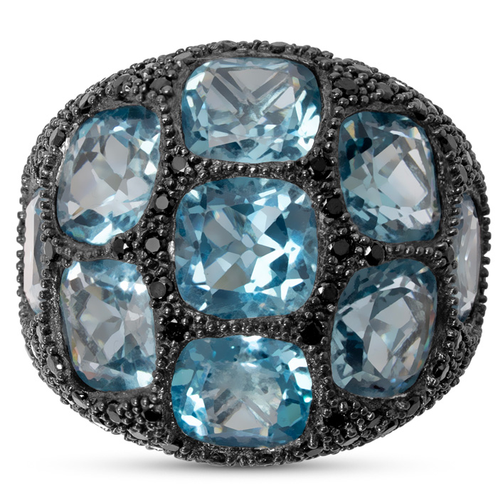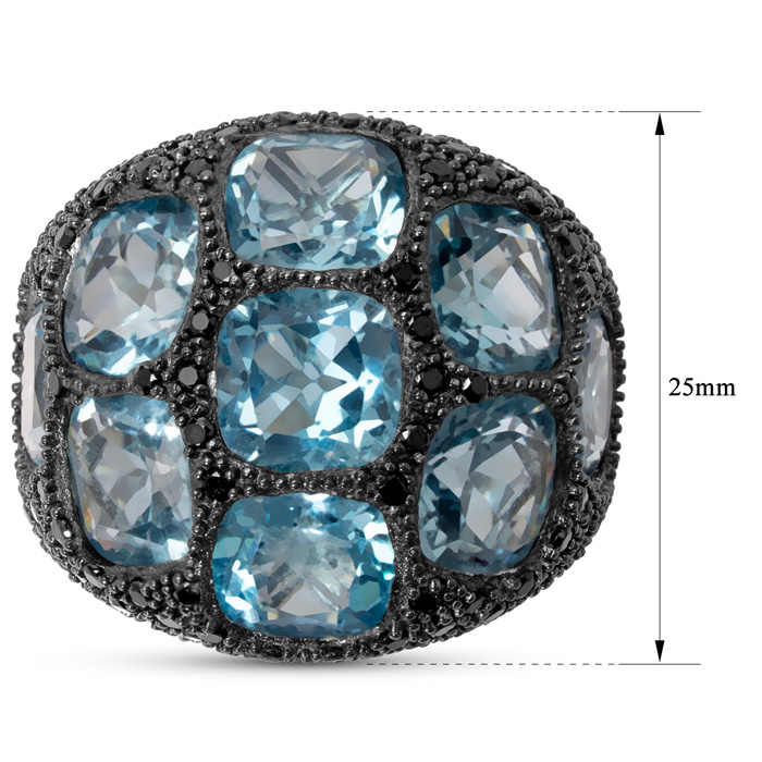 This unbelievable ring features 9 9mm cushion cut blue topaz gemstones surrounded by black spinel gemstones. The domed design spreads 1 inch across the finger and makes for the perfect cocktail ring. Total carat weight is approximately 9 carats. This ring is in sterling silver.