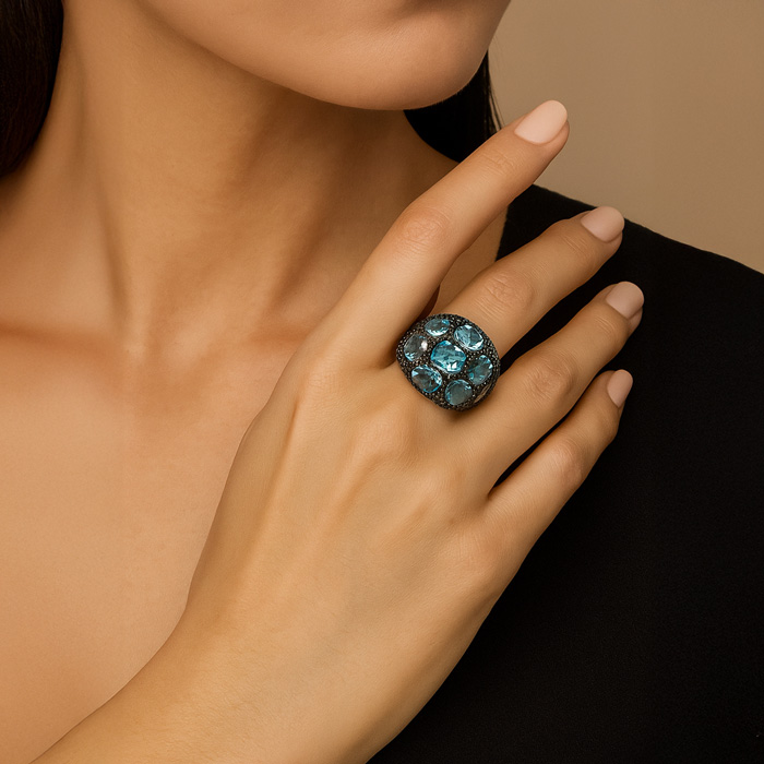Bold 9 Carat Blue Topaz and Black Spinel Statement Dome Ring In Sterling Silver