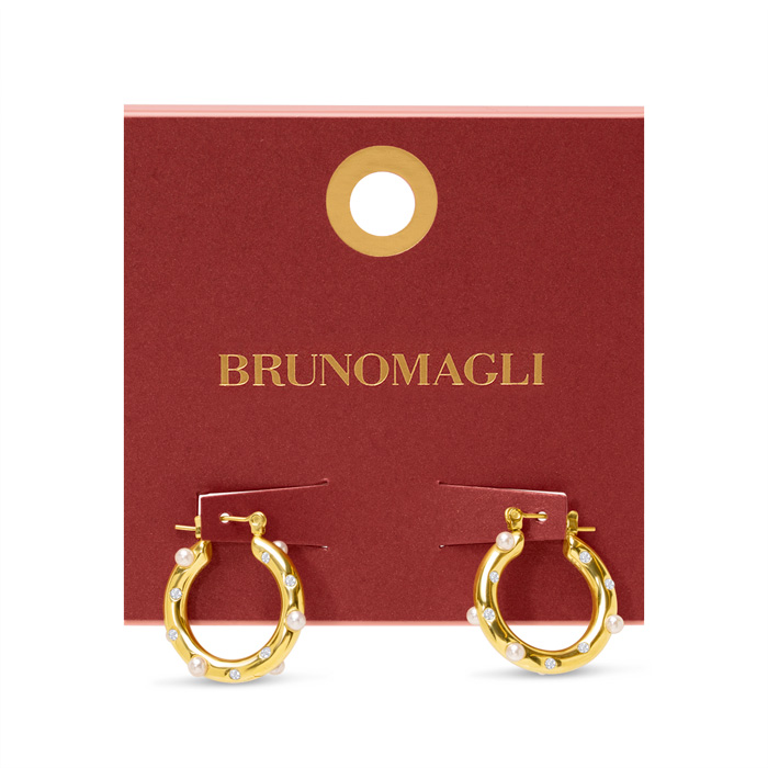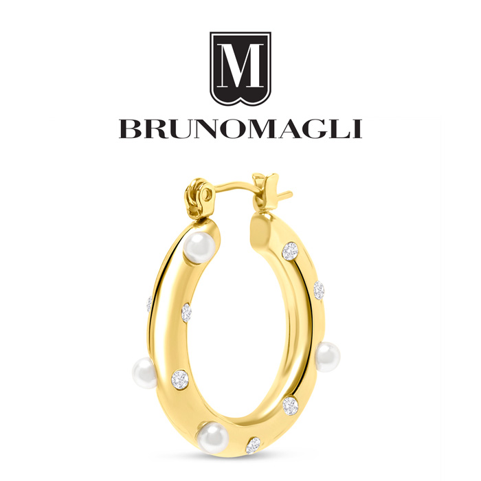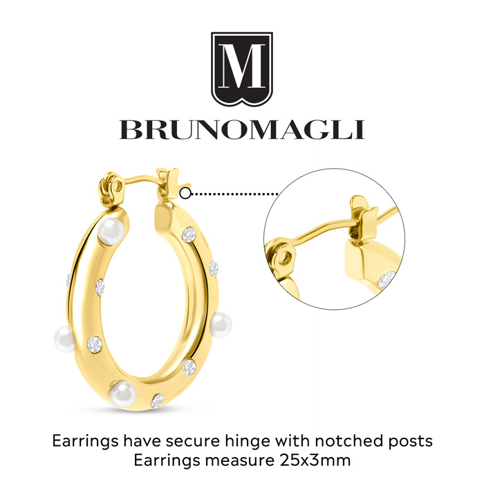 Bruno Magli Women’s Fashion Jewelry blends refined Italian craftsmanship with contemporary elegance, creating timeless accessories for the modern woman. Each piece is thoughtfully designed with high-quality materials, offering a balance of sophistication and style. From understated classics to bold statement designs, the collection adds a touch of luxury to any outfit, making Bruno Magli jewelry the perfect finishing accent for every occasion. These Bruno Magli Elisabetta Gold Hoop Earrings feature faux pearl and crystal accents and dangle down 1 inch and have secure, hinge with notched posts. These earrings are finely crafted in yellow gold tone over brass metal.
