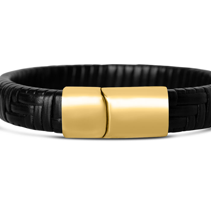 Bruno Magli Mens Classic Black Leather Bracelet, Gold