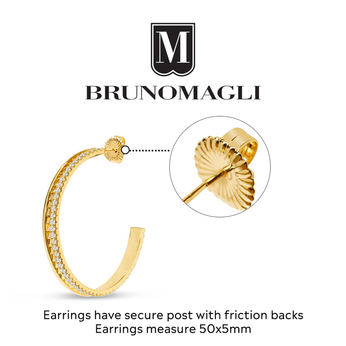 Bruno Magli Women’s Fashion Jewelry blends refined Italian craftsmanship with contemporary elegance, creating timeless accessories for the modern woman. Each piece is thoughtfully designed with high-quality materials, offering a balance of sophistication and style. From understated classics to bold statement designs, the collection adds a touch of luxury to any outfit, making Bruno Magli jewelry the perfect finishing accent for every occasion. These Bruno Magli Viviana Gold Hoop Earrings feature sparkling crystals and dangle down 2 inches and have secure, post with friction backs. These earrings are finely crafted in yellow gold tone over brass metal.