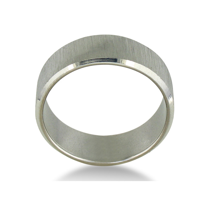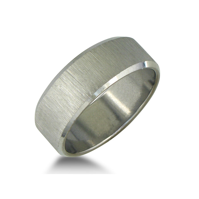 The reviewer who observed the trippy shininess of the ring was very right. The brushed finish looks more matte in the pictures but it easily reflects any light, so keep that in mind. I'm a younger college kid and don't mind a little bling, so this was a plus for me along with the near-ramen noodle price. It arrived two weeks ago in the correct size but with a couple imperfections, and has since collected a couple scratches. However, you can barely notice because of the brushed finish unless you stop and scrutinize it from inches away. Several friends and family have already complimented it, and a couple folks thought it was platinum! Needless to say, you cannot beat this ring for this price. It it were 10x as costly it would still be a good buy based on its fantastic appearance. Highly recommended!--A.S..